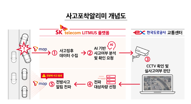 이 서비스는 SKT가 T맵을 통해 리트머스 플랫폼에 수집되는 사고 징후 데이터를 분석, 사고를 감지해 한국도로공사에 통보하고, 도로공사는 CCTV를 통해 사고 여부를 확인한 후, 리트머스 플랫폼을 통해 사고 발생 2km 내 후방 차량들의 T맵에 통보하는 시스템이다.
