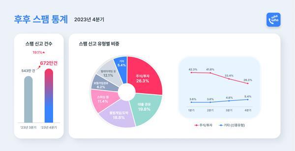 스팸 차단 애플리케이션 '후후'를 제공하는 브이피(사장 김진국)는 25일 2023년 4분기 스팸 통계를 통해 이같이 밝혔다.