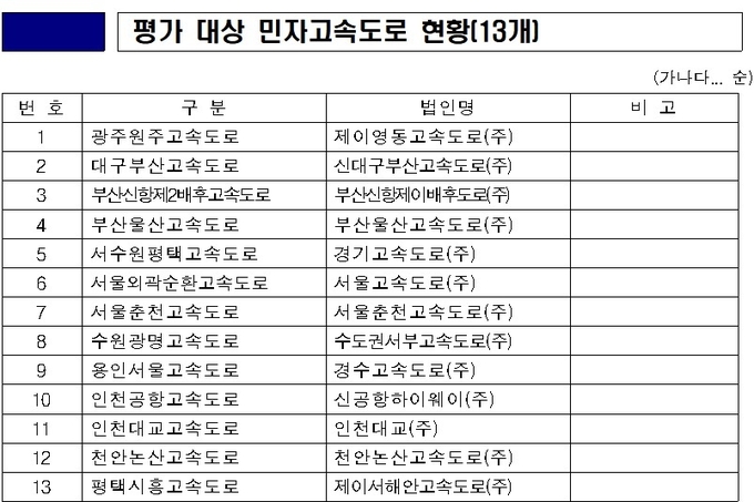 국토교통부는 운영기간이 1년 이상된 민자고속도로 13개를 대상으로 현장에서 지난달 11일부터 28일까지 운영평가를 했다고 11일 밝혔다.