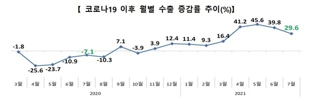 우리 수출은 지난해 11월(3.9%)부터 12월(12.4%), 올해 1월(11.4%), 2월(9.5%), 3월(16.6%), 4월(41.1%), 5월(45.6%), 6월(39.7%)까지 상승세를 이어왔다.