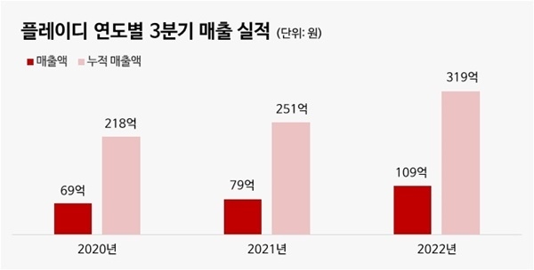 플레이디(대표이사 이준용)는 2022년 3분기 매출 109억원, 영업이익 8억원으로, 전년 동기 대비 각각 38%, 37% 증가한 실적을 기록했다고 11일 밝혔다.