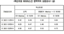 혼합형 구제역 백신의 효능이 단독형 백신보다 양호한 것으로 나타나 앞으로 구제역 백신수입에 전환이 불가피할 전망이다. 농림축산검역본부는 26일 지난해 12월 국내에서 분리된 구제역 진천바이러스와 관련해 면역학적 상관성(최고일치율 1 기준) 실험결과 구제역 백신주(O1 Manisa)는 0.29~0.59, 최근 긴급백신에 포함된 백신주(O 3039)는 0.47~0.57로 확인됐다고 밝혔다.특히 O1 Manisa와 O 3039가 혼합된 O형 백신이 단독백신(O1 Manisa 또는 O 3039)보다 면역학적 상관성이 높은 것으로 분석됐다. 혼합백신내 O1 Manisa와 바이러스의 면역학적 상관성은 0.46~1.00, 혼합백신내 O 3039와 바이러스의 면역학적 상관성은 0.36~0.81로 각각 나타났다. 면역상관성은 백신과 바이러스의 유사도를 따지는 것으로 항체형성율에도 영향을 미칠 것으로 추정되고 있다. 즉, 단독형 백신에 비해 혼합형 백신 구제역 방어에 상대적으로 효과가 있다는 것이다. 김태융 동물질병관리본부장은 "이번 실험결과 혼합백신의 면역학적 상관성이 양호했으나 가격 등을 감안해 수입여부는 농식품부 등과 협의후 결정할 것"이라고 말했다. 이번 실험결과는 검