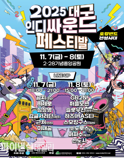 [파이낸셜데일리 박미화 기자] 대구광역시는 7일(금) 오후 6시, 8일(토) 오후 3시 이틀 동안 2.28기념중앙공원 중앙무대에서 ‘2025 대구인디싸운드페스티벌’을 개최한다고 밝혔다.