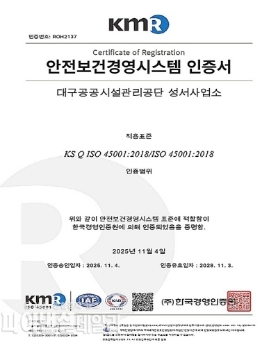 문기봉 대구공공시설관리공단 이사장은 “인증 과정에서 도출된 개선사항을 충실히 반영하고, 모니터링과 내부심사를 통해 안전·보건 수준을 지속적으로 높여가겠다”며, “앞으로도 시민의 안전을 최우선 가치로 삼아 안전경영을 실천해 나가겠다”고 말했다.