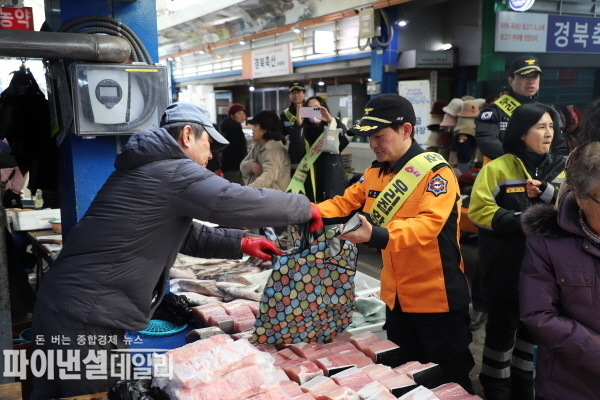 [파이낸셜데일리 박미화 기자] 의성소방서는 설 명절을 앞두고 11일 안계전통시장에 이어, 12일 의성전통시장을 방문해 지역 경제 활성화와 안전한 명절 분위기 조성을 위한 ‘전통시장 장보기’행사 및 화재 예방 캠페인을 펼쳤다고 밝혔다.