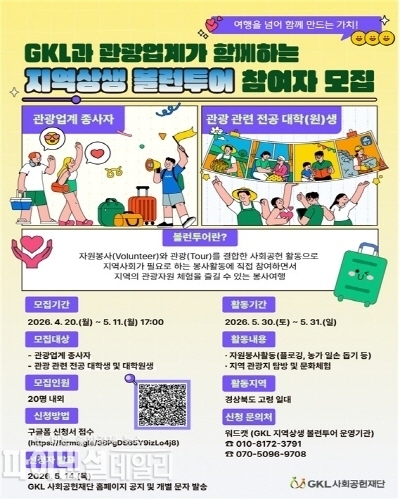 이와 함께 ‘GKL과 함께하는 행복여행’ 사업 참여기관도 모집 중이다. 해당 사업은 관광 취약계층 가족을 대상으로 1박 2일 여행을 지원하는 프로그램으로, 가족 간 소통과 정서적 회복을 돕기 위해 마련되었고 7월 4일부터 5일까지 고령에서 운영된다.