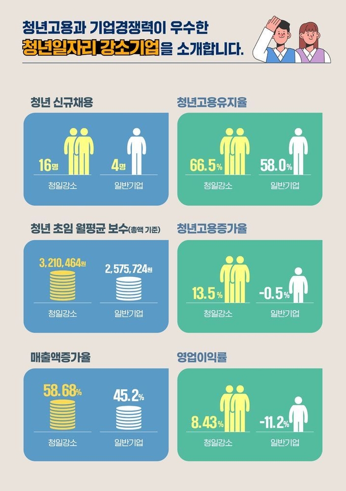 이들 224곳의 평균 청년 신규채용 인원은 16명으로 일반기업(4명)보다 12명 많은 것으로 나타났다. 청년초임 월평균보수는 321만원으로 일반기업(258만원)보다 63만원 많았다. 매출액 증가율, 청년고용유지율 역시 각각 13.5%p, 8.5%p 높았다.