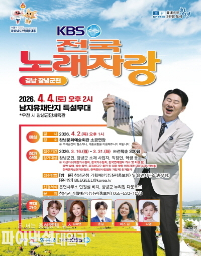 [파이낸셜데일리 박미화 기자] 창녕군은 오는 4월 4일 오후 2시 남지유채단지 특설무대에서 대한민국 대표 국민 참여 프로그램 ‘전국노래자랑 창녕군편’을 개최한다고 밝혔다.