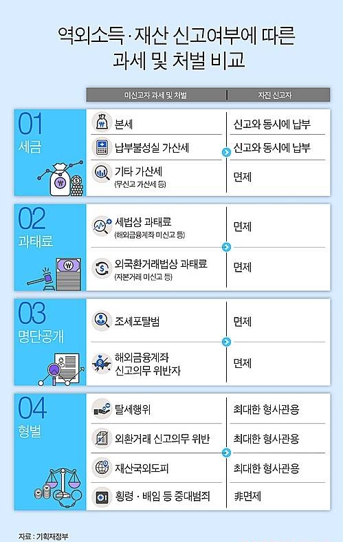 1일 기획재정부에 따르면 역외 소득·재산 자진신고 대상자는 우리나라 거주자와 내국 법인이다. 세법상 신고 의무가 있는 해외 소득과 재산은 모두 자진신고 대상이 된다.