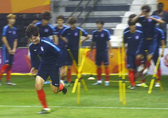 27일 오전 1시30분 카타르와 2016 아시아축구연맹(AFC) U-23(23세 이하) 챔피언십 4강전을 치르는 선수들은 경기가 열릴 그라운드의 잔디를 직접 밟으며 감각을 익혔다.