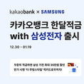 [파이낸셜데일리 송지수] 카카오뱅크는 한 달간 저금하면 삼성전자 가전 구매 혜택과 경품을 받을 수 있는 '한달적금 with 삼성전자'를 출시한다고 30일 밝혔다. 한달적금은 100원부터 3만원까지 매일 하루 한 번 저축하는 습관을 키울 수 있도록 만든 단기 상품이다. 이번 적금은 삼성전자에서 사용할 수 있는 할인 혜택과 경품 등을 제공하는 제휴상품이다. 내년 1월 19일까지 21일간 한정 판매한다. 1인당 1계좌만 개설할 수 있다. 가입한 고객은 3회차, 6회차, 11회차에 납입하면 삼성전자 가전 할인 혜택을 받을 수 있다. 세부적으로 ▲3회차는 오프라인 매장인 삼성스토어 또는 백화점에서 사용 가능한 최대 30만원 할인쿠폰 ▲6회차는 삼성전자 혼수클럽이나 입주클럽에 가입한 후 제휴 삼성카드로 가전 등 2500만원 이상 결제 시 쓸 수 있는 멤버십 90만 포인트와, 삼성카드 쇼핑몰 60만원 할인쿠폰 등 150만원 상당 혜택 ▲11회차는 이마트 내 삼성전자에서 이용 가능한 최대 5만원 할인쿠폰을 준다.