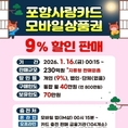 [파이낸셜데일리 박미화 기자] 포항시는 오는 16일부터 2026년 카드형·모바일 포항사랑상품권(이하 포항사랑카드)의 첫 할인판매를 시작한다고 밝혔다. 이번 할인판매는 연초 민생경제 회복과 활력 제고를 위해 선제적으로 마련됐으며, 230억 원 규모를 9% 할인 판매로 진행된다. 지역 골목상권과 전통시장에 활력을 불어넣을 수 있기를 기대하고 있다. 시는 올해 포항사랑상품권 발행 규모를 지난해 대비 500억 원을 확대해 총 3,500억 원을 발행하고, 상시(매월)는 포항사랑카드 9% 할인, 명절에는 포항사랑카드와 지류형 상품권을 10% 특별할인 판매한다. 올해 포항사랑카드 개인 구매한도는 월 40만 원이며, 보유한도는 70만 원이다. 구매한도는 작년 50만 원에서 40만 원으로 하향 조정해 보다 많은 시민들이 혜택을 볼 수 있게 했다. 시는 포항사랑상품권 발행으로 시민들과 소상공인 모두가 실질적인 혜택을 체감할 수 있도록 지역경제 선순환 구조를 한층 더 강화하고 연중 민생경제 회복에 힘 쏟는다는 방침이다. 이번에 진행하는 할인판매는 오는 16일 0시 15분 모바일 앱(iM샵)과 104개 판매 대행 금융기관 영업점에서 충전할 수 있다. 포항사랑카드는 실물 카드 결제