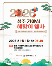 [파이낸셜데일리 박미화 기자] (사)성주문화원은 2026년 병오년(丙午年) 1월 1일(목) 06시 40분, 해맞이 대표 명소인 가야산 역사신화테마관 상아덤마당에서 「2026년 성주 가야산 해맞이 행사」를 개최한다고 밝혔다. 이번 행사는 군민 맞이 길놀이, 밴드공연 등 다양한 식전행사로 시작하여, 희망 메시지 전달 및 축시 낭독, 새 희망 퍼포먼스와 해맞이 떡 자르기 등 희망찬 새해를 여는 프로그램들로 진행될 예정이며, 특히 군민의 안녕을 담은 희망 퍼포먼스를 준비하여 병오년 새해 해맞이 행사의 대미를 장식 할 예정이다. 이와 더불어 행사를 찾은 방문객들에게 새해 첫날 따뜻한 온기를 제공하기 위해 지역의 자원봉사단체가 참여하는 2026인분의 복떡국, 갱시기, 어묵, 차, 떡 등 다양한 세시음식과 핫팩 등 나눔 행사와 소원지 쓰기 체험, 포토존을 준비하여 등 더욱 풍성한 해맞이 행사가 이루어질 예정이다. 또한 이번 2026 성주 가야산 해맞이 행사는 성주경찰서와 소방서 등 관계기관 협조와 행사장 안전요원 및 교통안전 관리요원 배치, 의료지원 부스 운영 등을 통해 다양한 안전사고에도 철저히 대비 할 방침이다. 행사관계자는 “성주가야산 해맞이 행사는 군민이 함께 만