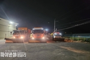 [파이낸셜데일리 박미화 기자] 성주군은 지난 2일 새벽부터 시작된 강설로 인한 교통체증 및 사고에 대비해 ‘안전한 출근길 조성’에 총력을 기울였다고 밝혔다. 2일 새벽부터 강설이 예보되어 1일 19시 ~ 22시 까지 관내 주요 도로 제설제 사전살포를 완료하였으며, 2일 새벽부터는 안전과, 건설과 및 읍‧면에서 선제적 비상 근무에 돌입하여 위험지역 사전 순찰, 강설 시작후 제설 차량 긴급 투입으로 관내 주요 간선도로, 고갯길, 교량 등 상습 결빙 구간을 중심으로 선제적 제설작업을 시행하였다. 특히, 지난 1월에 발생한 도로 살얼음(블랙아이스) 발생구간에 대한 집중 관리로 사고 재발 방지, 군 제설팀과 읍·면 제설팀의 긴밀한 협조 하에 교통 혼잡이나 주민 불편사항 등이 발생하지 않도록 제설 대응 체계 가동에 만전을 기하였다. 성주군 관계자는 “강설로 인한 교통사고와 주민 불편사항이 발생하지 않도록 제설 대응 태세 유지에 최선을 다하고 있다.”며 “주민들도 빙판길 운전 주의하시고, 내 집앞 ‧ 내 점포 앞 눈 치우기에 적극적으로 동참해 주시길 바란다”고 당부했다. 한편, 영하권의 강추위가 지속됨에 따라 보온 및 방한 철저, 취약계층 한랭 질환유의, 농‧축산물 냉해