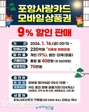 [파이낸셜데일리 박미화 기자] 포항시는 오는 16일부터 2026년 카드형·모바일 포항사랑상품권(이하 포항사랑카드)의 첫 할인판매를 시작한다고 밝혔다. 이번 할인판매는 연초 민생경제 회복과 활력 제고를 위해 선제적으로 마련됐으며, 230억 원 규모를 9% 할인 판매로 진행된다. 지역 골목상권과 전통시장에 활력을 불어넣을 수 있기를 기대하고 있다. 시는 올해 포항사랑상품권 발행 규모를 지난해 대비 500억 원을 확대해 총 3,500억 원을 발행하고, 상시(매월)는 포항사랑카드 9% 할인, 명절에는 포항사랑카드와 지류형 상품권을 10% 특별할인 판매한다. 올해 포항사랑카드 개인 구매한도는 월 40만 원이며, 보유한도는 70만 원이다. 구매한도는 작년 50만 원에서 40만 원으로 하향 조정해 보다 많은 시민들이 혜택을 볼 수 있게 했다. 시는 포항사랑상품권 발행으로 시민들과 소상공인 모두가 실질적인 혜택을 체감할 수 있도록 지역경제 선순환 구조를 한층 더 강화하고 연중 민생경제 회복에 힘 쏟는다는 방침이다. 이번에 진행하는 할인판매는 오는 16일 0시 15분 모바일 앱(iM샵)과 104개 판매 대행 금융기관 영업점에서 충전할 수 있다. 포항사랑카드는 실물 카드 결제