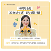 [파이낸셜데일리 송지수] KB국민은행은 금융 환경의 변화에 대응하고 새로운 가치를 창출할 인재를 선발하기 위해 2026년 상반기 신입행원을 채용을 실시한다고 18일 밝혔다. 채용규모는 110여명이다. 이번 채용은 ▲UB(기업고객금융·고객자산관리) ▲지역인재 ▲전역장교 ▲환경·사회·지배구조(ESG) 동반성장 ▲보훈 등 총 5개 부문으로 진행된다. 각 부문의 특성에 맞춘 맞춤형 채용으로 운영된다. 서류 접수는 오는 25일까지다. 국민은행 공식 채용 홈페이지에서 지원할 수 있다. 전형 절차는 ▲서류전형 ▲필기전형 ▲1차 면접전형 ▲2차 면접전형 순으로 진행된다. 최종 합격자는 6월 중 발표될 예정이다. UB(Universal Banker) 부문은 자산관리전문가(PB)와 기업금융전문가(RM)로 성장할 인재를 선발한다. 지역인재 부문은 지역 금융전문가 양성을 목표로 채용을 진행한다. 조직 운영 경험과 리더십을 갖춘 인재 선발을 목적으로 전역장교 채용도 함께 진행된다. ESG동반성장과 보훈 부문 채용도 운영한다. ESG동반성장 부문은 장애인, 기초생활수급자, 북한이탈주민, 다문화가정 자녀 등을 대상으로 한다. 보훈 부문은 국가보훈대상자나 그 가족을 대상으로 한다. 채용