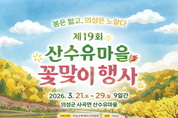 [파이낸셜데일리 박미화 기자] 의성군(군수 김주수)은 올해로 19회째를 맞는 ‘산수유마을꽃맞이행사’가 3월 21일(토)부터 3월 29일(일)까지 의성 산수유 마을 일원(사곡면 화전 2·3리)에서 개최된다고 밝혔다. 사곡면에 위치한 산수유꽃피는마을은 약 3만여 그루의 산수유나무가 군락을 이루는 의성군 대표 봄 관광지로, 매년 봄이면 노란 산수유꽃이 만개해 장관을 이룬다. 산수유꽃은 ‘영원불변의 사랑’이라는 꽃말을 지닌 꽃으로, 매화 다음으로 이른 봄에 피어나는 대표적인 봄꽃이다. 의성 산수유마을에서는 매년 3월부터 4월 초까지 노란 산수유꽃이 장관을 이루며 많은 관광객들의 발길을 끌고 있다. 행사 기간 동안 산수유 꽃길을 따라 다양한 공연과 체험 프로그램이 운영된다. 지역예술단체와 전문예술인이 참여하는 버스킹 공연이 열리며. 초청 가수로는 21일 ‘에녹’, 29일 ‘린’이 무대에 올라 행사 분위기를 한층 더 뜨겁게 달굴 예정이다. 또한, 산수유압화작품 전시, 바람개비 만들기, 오카리나 만들기 체험, 의성 캐릭터 ‘육쪽이를 찾아라’ 이벤트 등 다양한 체험 프로그램이 마련된다. 이와 함께 농특산물 판매장터와 먹거리장터도 운영돼 산수유마을을 찾는 관광객들에게 풍성한