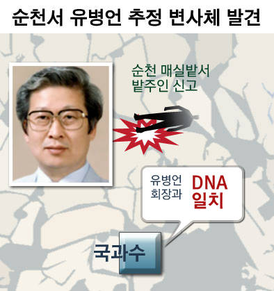 그 결과 최근 유 전 회장의 친형 병일(75·구속기소)씨 DNA와 일치한다는 결과가 나타났다. 시신과 유 전 회장의 친형인 병일씨가 형제일 확률이 99% 이상이라는 결론이 나온 것으로 전해졌다.