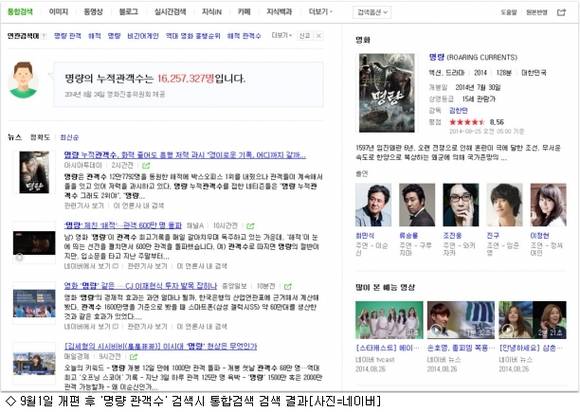 새로워진 네이버 통합검색은 '질의응답(Question Answering)'식으로 영화진흥위원회가 제공하는 정답 정보를 즉답 형태로 제공한다. 또 일상에서 지인과의 실제 대화에서 나올법한 질문들을 통계적으로 추출해 출연 배우, 영화 정보 등의 연관 정보까지 제공한다.