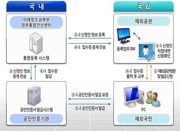 앞서 지난해 1월에는 주오사카 총영사관, 주말레이시아 대사관, 주시카고 총영사관, 주애틀랜타 총영사관, 주상파울루 총영사관, 주아르헨티나 대사관, 주프랑크푸르트 총영사관 등 7곳에서 공인인증서 발급이 시작됐다.