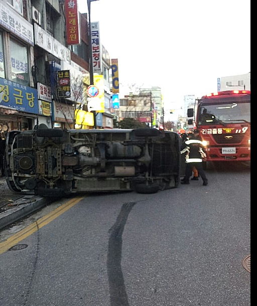 1일 오후 5시3분께 강원 원주시 중앙동 보건소 앞에서 박모(42)씨가 운전하던 승용차와 또 다른 박모(54)씨가 운전하던 승합차량이 부딪치는 사고로 승합차량이 전도됐다.