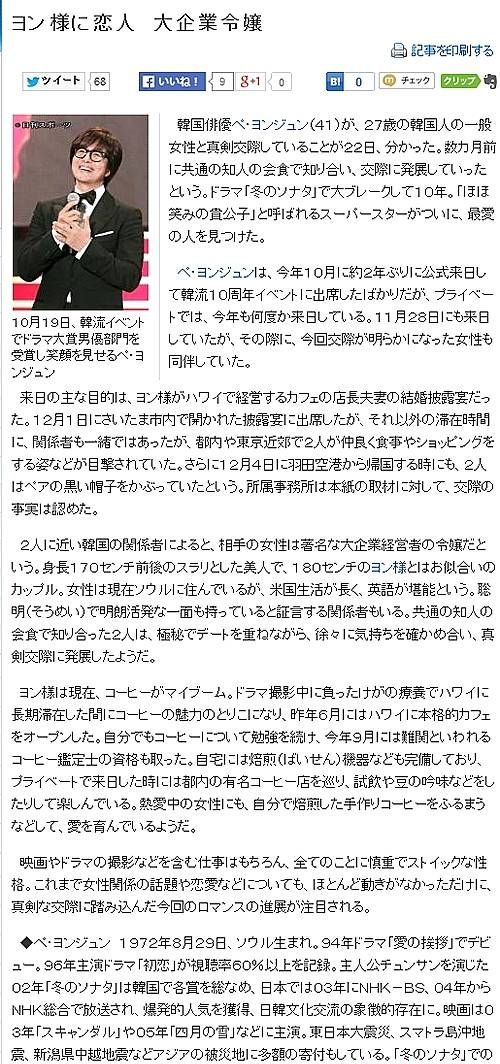 닛칸스포츠는 또 "배용준은 11월28일 일본을 방문했을 이 여성을 동반했다"며 "당시 배용준은 하와이에서 카페를 운영하는 지인의 결혼식 피로연에 참석했다가 연인과 사이 좋게 식사를 하고 쇼핑을 하는 모습이 목격됐다"고 보도했다.