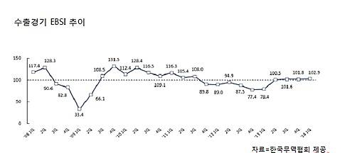 한국무역협회 국제무역연구원이 국내 958개 수출업체를 대상으로 '2014년 1/4분기 수출산업경기전망(EBSI)'을 조사한 결과에 내년 1분기 EBSI는 전분기(101.8)보다 소폭 높아진 102.9를 기록했다.