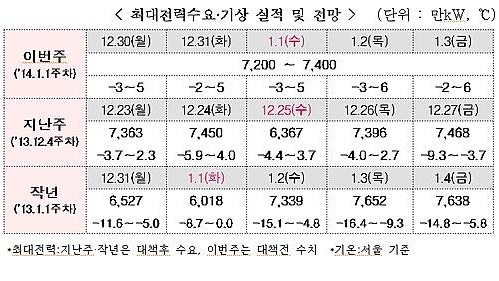최대전력수요는 연말연시 조업감소와 기온상승 효과 등으로 전주 7468㎾(12월27일)보다 낮은 7200만~7400만㎾로 예상된다.
