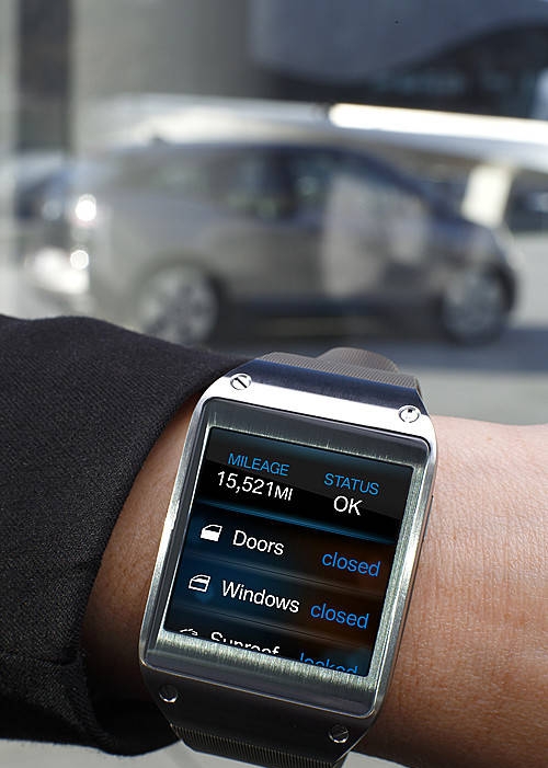 삼성전자는 BMW와 공동으로 개발한 갤럭시 기어 전용 i리모트(iRemote) 애플리케이션(앱)을 통해 갤럭시 기어로 BMW사 최초의 전기 자동차인 i3를 제어하는 다양한 상황을 시연했다.