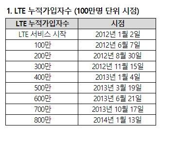 KT는 지난해 6월 LTE 가입자 600만명 돌파 후 700만명을 넘기는데 4개월이 걸렸으나, 광대역 LTE 서비스를 제공한 지난해 9월 이후 3개월만에 800만명을 넘어섰다.