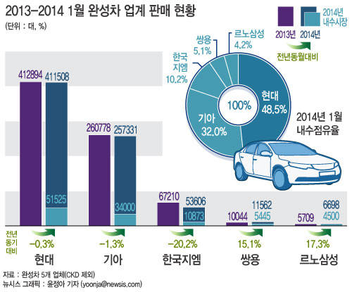 3일 완성차 5사(현대·기아·한국GM·쌍용차·르노삼성)의 지난해 판매실적(CKD 제외)을 종합한 결과, 1월 국내외 판매량은 전년 같은 달보다 2.1% 감소한 74만705대로 집계됐다.