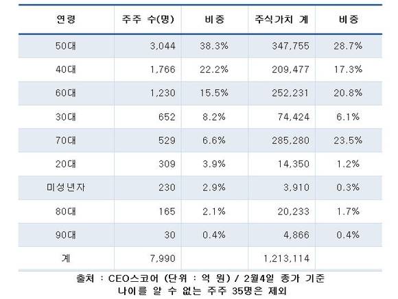 6일 기업경영성과 평가 사이트인 CEO스코어는 코스피와 코스닥 시장에 상장돼 있는 총 1769개사의 대주주 및 특수관계인, 5% 이상 주식을 소유한 주요주주 1만3863명을 전수 조사한 결과 주식가치(4일 종가 기준)가 1억원을 넘는 주식부자는 7990명(57.6%)이었다.