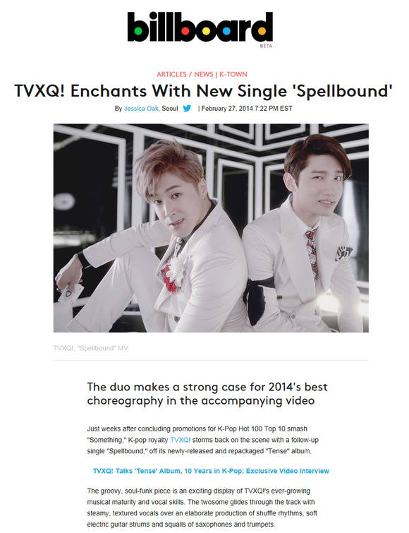 빌보드는 27일 ‘동방신기 신곡 수리수리로 마법을 부리다’(TVXQ! Enchants With New Single ‘Spellbound) 제하의 기사에서 ‘수리수리’와 뮤직비디오, 퍼포먼스를 자세히 소개했다.