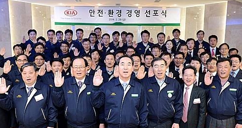 기아자동차는 지난달 28일 경기도 소하동의 생산교육센터에서 이삼웅 사장을 비롯해 공장장인 김종웅 부사장 등 60여명의 임직원들이 참석한 가운데 '안전환경경영 선포식'을 가졌다.