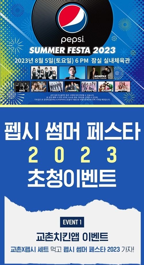 [파이낸셜데일리 서현정 기자] 치킨 프랜차이즈 교촌치킨이 오는 8월 5일 서울 잠실 실내체육관에서 열리는 ‘펩시 썸머 페스타 2023’ 티켓 증정 프로모션을 진행한다.