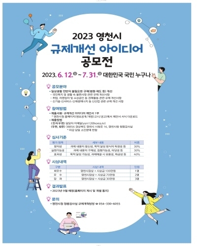 [파이낸셜데일리 박미화 기자] 경북 영천시(시장 최기문)는 시민 생활과 생업 현장에 숨어있는 불합리한 규제를 발굴하기 위해 오는 12일부터 7월 31일까지 ‘2023년 규제개선 아이디어 공모전’을 개최한다고 밝혔다.