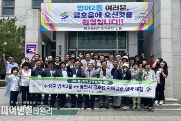 [파이낸셜데일리 박미화 기자] 경북 영천시 금호읍(읍장 최상국)과 대구광역시 수성구 범어2동(동장 이영렬)은 13일 금호읍 행정복지센터 대회의실에서 자매결연 협약식을 통해 교류협정(MOU)를 체결하며 협력과 도약의 맞손을 잡았다.