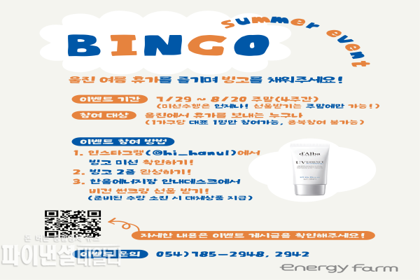 ‘에너지빙고’는 문화관광 활성화를 위해‘울진 관광명소 방문사진 인증’, ‘한울에너지팜에서 원자력 퀴즈 풀기’ 등으로 구성되어 있으며, 이번 이벤트는 29일부터 8월 20일까지 시행한다. 참가를 원하는 사람은 한울본부 인스타그램(@hi_hanul)에서 3×3 빙고 미션을 확인하고 빙고 2줄을 완성하면 된다.
