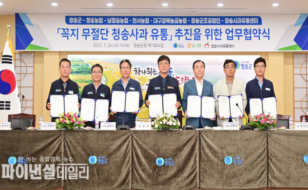 [파이낸셜데일리 박미화 기자]경북 청송군(군수 윤경희)은 26일 군 관내 6개 사과 계통출하조직(청송농협, 남청송농협, 현서농협, 대구경북능금농협, 청송사과유통센터, 청송군조공법인)과 “꼭지 무절단 청송사과 유통” 추진을 위한 업무협약(MOU)을 체결했다고 밝혔다.