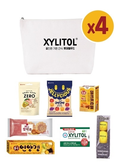 총 4개 셋트로 구성되었고, 구성품은 롯데웰푸드의 대표 간식인 자일리톨, 제로 후르츠젤리, 구미 당기는 구미, 밀크카라멜, 미니 쌀약과, 8곡 영양갱과 볼빅 3구 골프공, 그리고 롯데웰푸드에서 특별히 제작된 파우치가 들어있다.