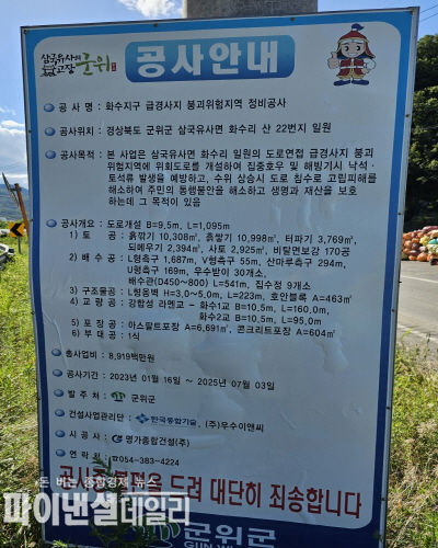 [파이낸셜데일리 박미화 기자] 경북 군위군 삼국유사면 화수리 산 22번지 일원 군위군에서 발주한 화수지구 급경사지 붕괴위험지역 정비공사를 총 공사금액 8. 919백만원으로 명가종합건설에서 시공중이며 건설사업감리단은 한국종합건설과 (주)우수이앤씨이다.