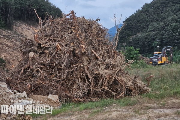 이곳 공사현장은 도로개설을 위한 임목 철거작업에서 발생한 임목폐기물을 3일이상 방치 할 경우에는 반드시 덮게를 덮어야 마땅하나 그대로 방치해 놓은 상태로 작업이 진행 중이다.