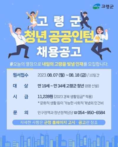 [파이낸셜데일리 박미화 기자] 고령군(군수 이남철)은 지난 7일부터 18일까지 10일간 ‘청년 일자리 공공인턴사업’ 참여자 8명을 모집한다.