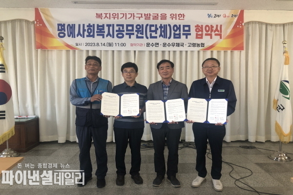 [파이낸셜데일리 박미화 기자] 고령군(군수 이남철) 운수면은 14일(월) 11시에 운수면 유관기관(운수우체국, 고령농협)장과 복지사각지대 발굴 및 지원을 위하여 업무협약을 체결했다고 밝혔다.