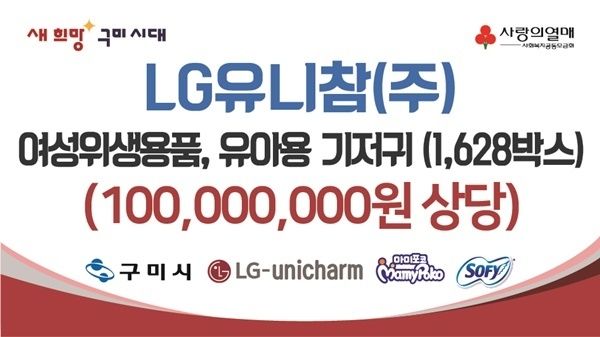 엘지유니참은 7일 경북 구미시청을 통해 생리대와 유아 기저귀 약 34만 매의 위생용품을 전달했다. 엘지유니참은 제품 생산 공장이 위치한 구미의 지역사회 활성화를 위해 경제적인 어려움을 겪는 취약계층을 대상으로 지속적으로 제품을 지원하고 있다.