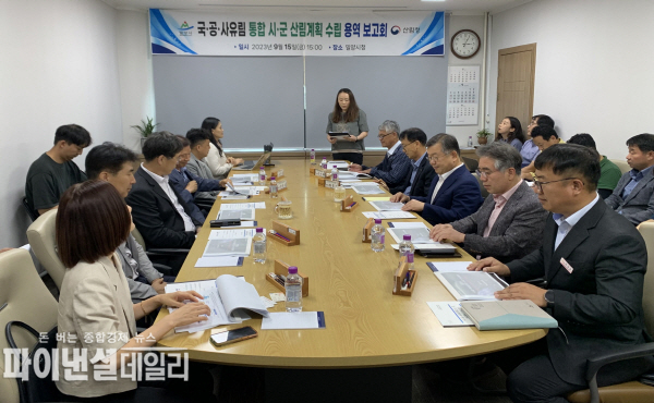 [파이낸셜데일리 박미화 기자] 남부지방산림청(청장 남송희)은 국유림과 공·사유림을 구분하여 수립하고 있는 계획을 하나로 묶는 통합 산림계획 수립 용역사업을 추진하고 있으며, 성과품 품질 제고를 위해 9월 15일 밀양시청에서 중간보고회를 개최했다고 밝혔다.