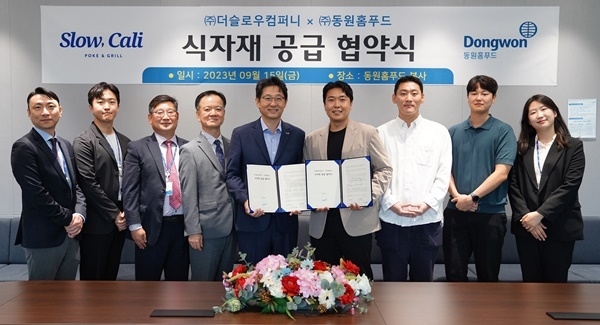 동원홈푸드는 15일 서울 서초구 동원산업빌딩에서 진행된 업무 협약을 통해 향후 전국 110여개 ‘슬로우캘리’ 가맹점에 연간 150억원 규모의 식자재를 공급하게 됐다.