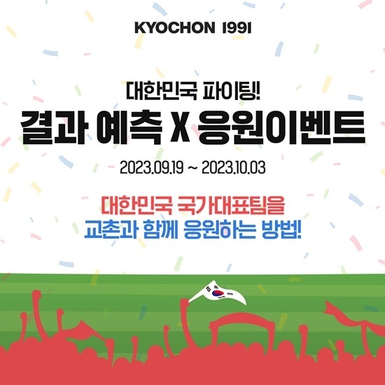 교촌은 10월 3일까지 교촌치킨 앱을 통해 남자 축구, 여자 축구, 야구 3개 종목에서 예정된 경기의 결과를 예측하고 응원 메시지를 작성한 고객에게 치킨 교환권을 선물한다.
