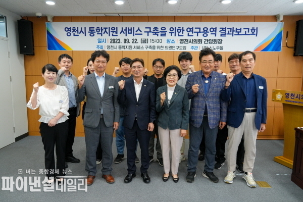 [파이낸셜데일리 박미화 기자] 영천시의회 의원연구단체인 “영천시 통학지원 서비스 구축을 위한 의원연구모임”(대표 우애자 의원, 이영기 의원, 이영우 의원)에서는 22일 영천시의회 간담회장에서 “영천시 통학 지원 서비스 구축을 위한 연구”의 최종보고회를 가졌다.