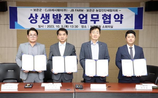 CJ프레시웨이는 보은군청에서 최재형 보은군수, 이형석 보은군 농업인단체협의회장, 채진웅 제이비팜 대표이사와 보은군 농업의 발전과 농산물 유통 활성화를 위한 협력 계획을 공유했다.